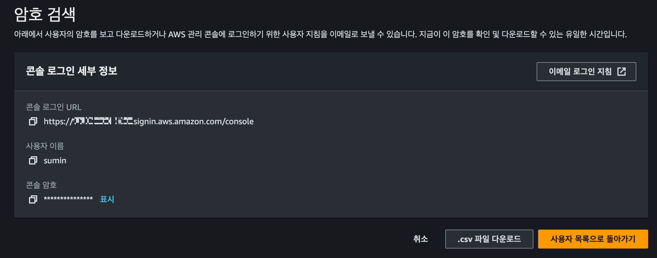 - 바로 밑에 생성된 IAM 사용자를 위한 로그인 URL을 통해 로그인