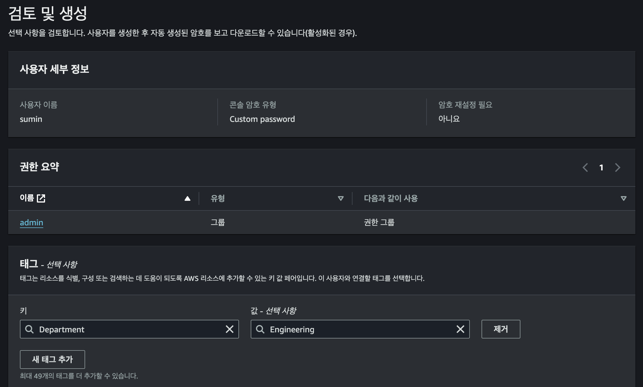 검토 및 생성 단계에서 이전 단계에서 추가한 admin 권한을 확인할 수 있고, 태그를 다음과 같이 추가할 수도 있다.