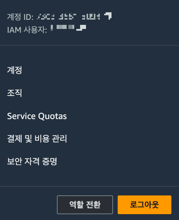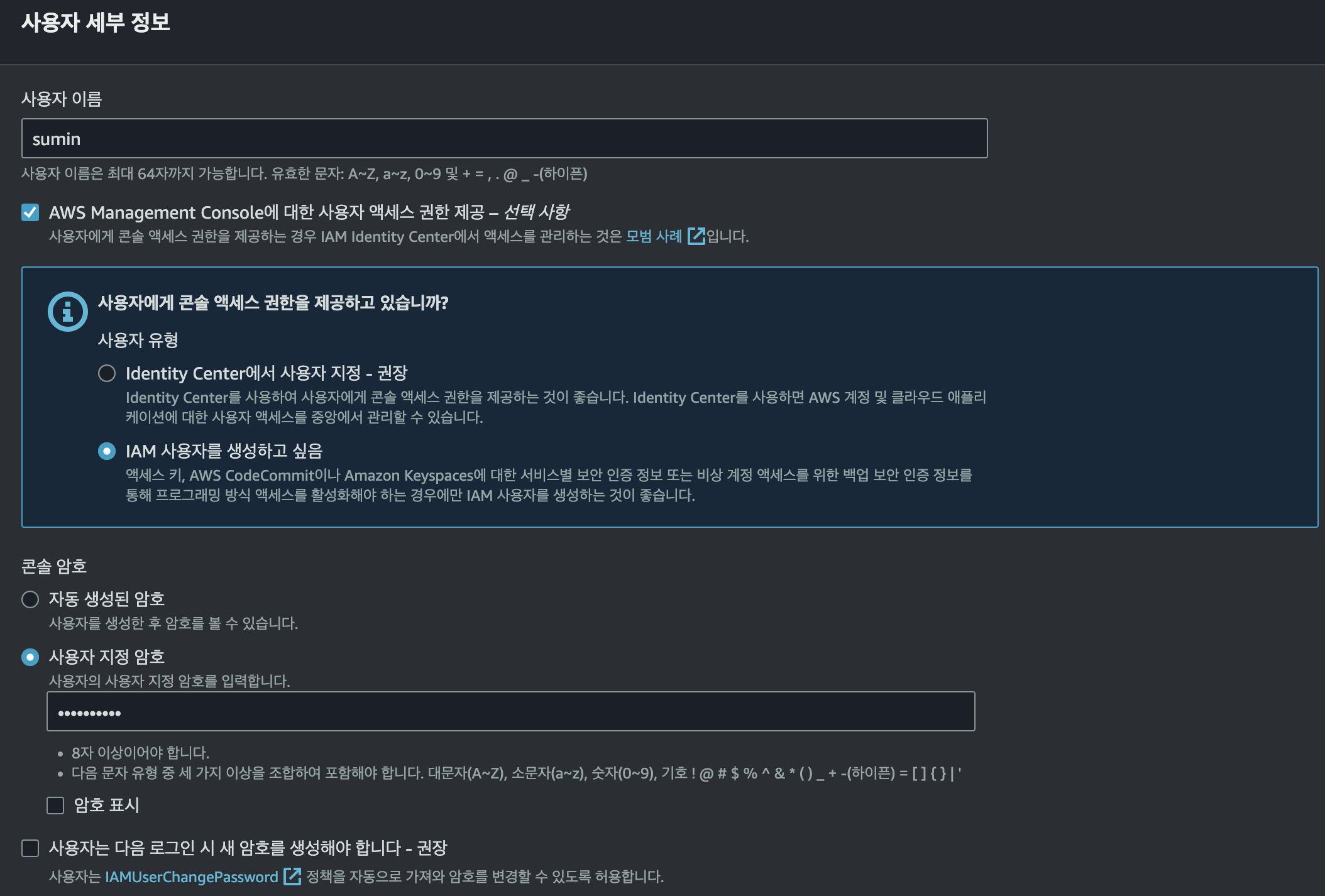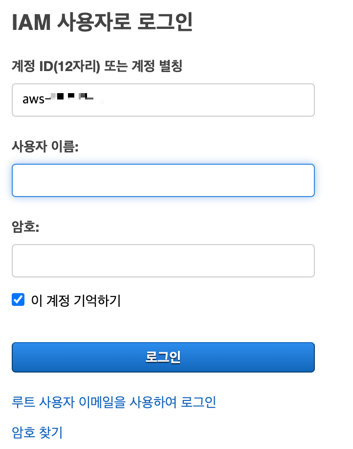 사용자 이름과 암호에는 방금 전에 생성한 사용자의 이름과 암호를 적어주면 해당 IAM 사용자로 로그인되는 것을 확인할 수 있다.