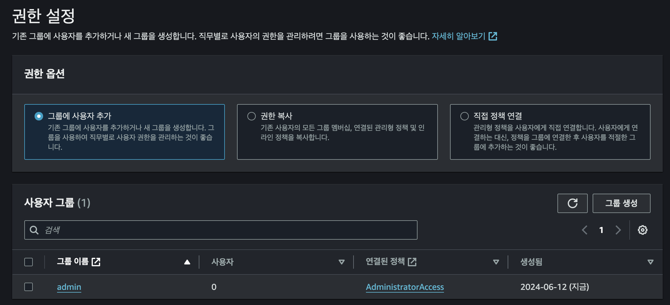권한 설정 단계에서 '그룹에 사용자 추가'를 눌러 AdministratorAccess 다음과 같이 정책을 추가하기