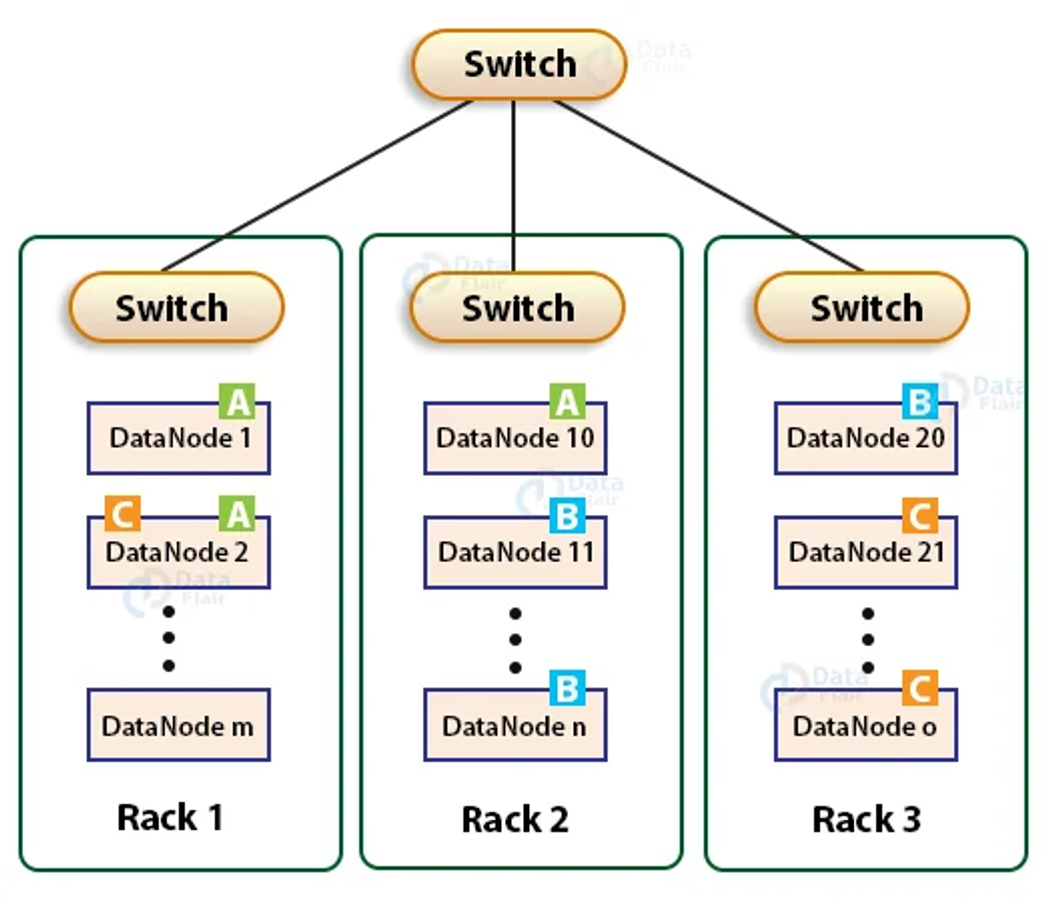 : Hadoop에서는 복제본을 저장할 때 서로 다른 Rack에 분산해서 저장하는 것이 일반적이다. 예를 들어, 하나의 복제본은 Rack 1에, 또 다른 복제본은 Rack 2에 저장한다. 이를 통해 Rack 전체가 장애가 발생했을 때도 다른 Rack에 저장된 복제본을 이용해 데이터를 복구할 수 있다.