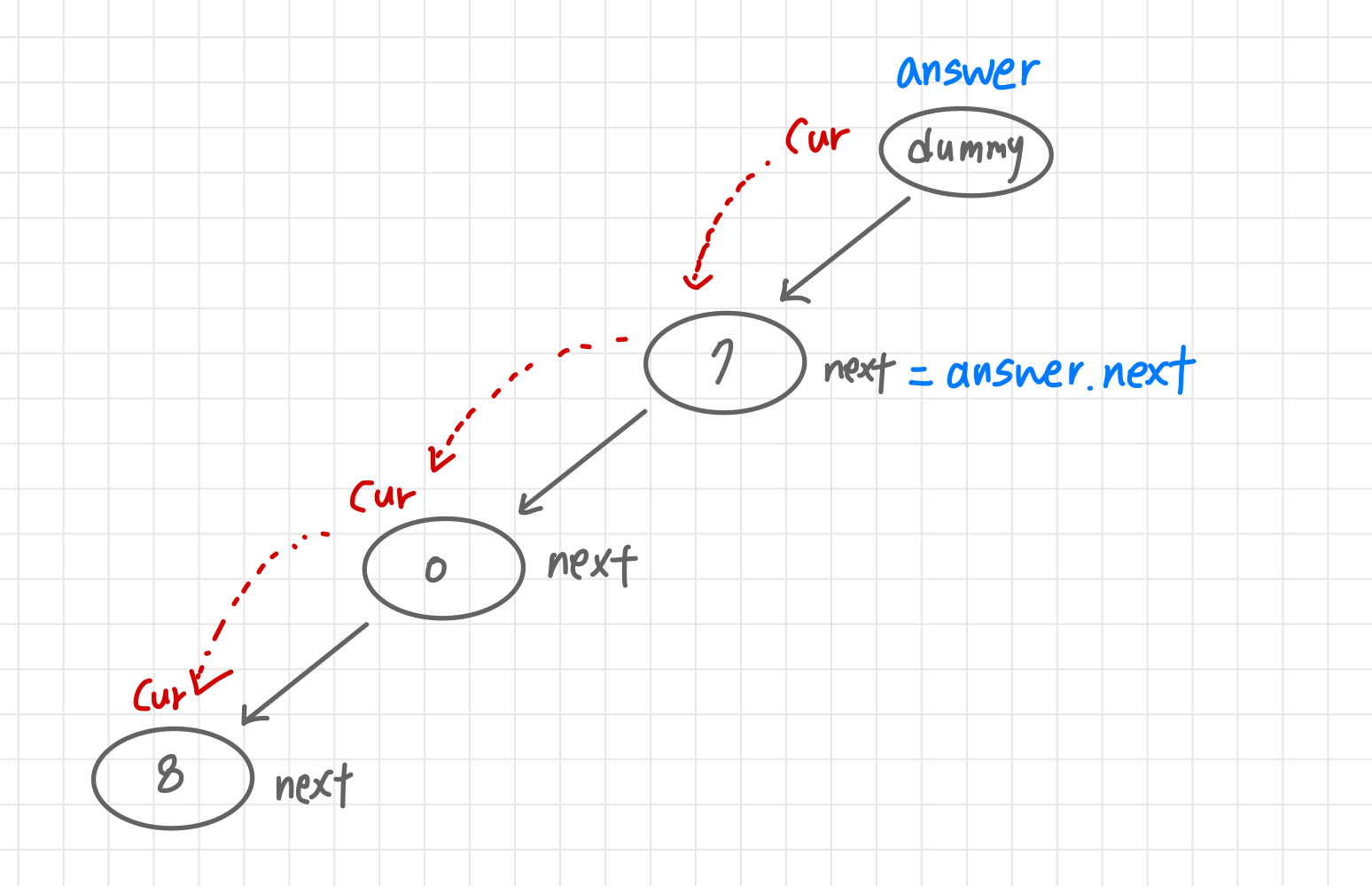 1. answer를 Dummy Node로 만들어 놓고, 현재 노드(cur) 역시 answer에서 시작한다.