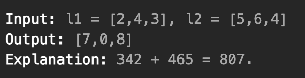 l1 = [2, 4, 3], l2 = [5, 6, 4]라면 결과는 [7, 0, 8]이 나와야 한다.