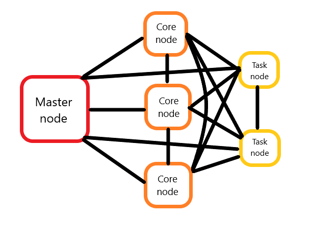 2. 코어 노드(Core node): 클러스터의 하둡 분산 파일 시스템(HDFS)에 데이터를 저장하고 작업을 실행하는 노드이다. 멀티 노드 클러스터에는 적어도 하나의 코어 노드가 있다.